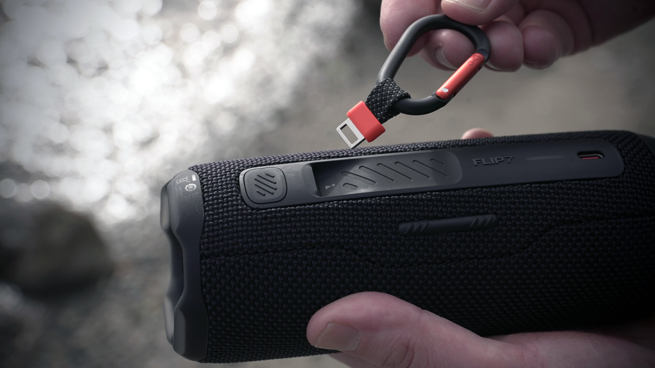 Для переноски JBL Flip 7 предусмотрена система сменных креплений Pushlock: ремешок и карабин для закрепления на сумке или рюкзаке. Кроме того, заряда хватает на 14 часов работы. А с функцией Playtime Boost — до 16 часов звучания.
